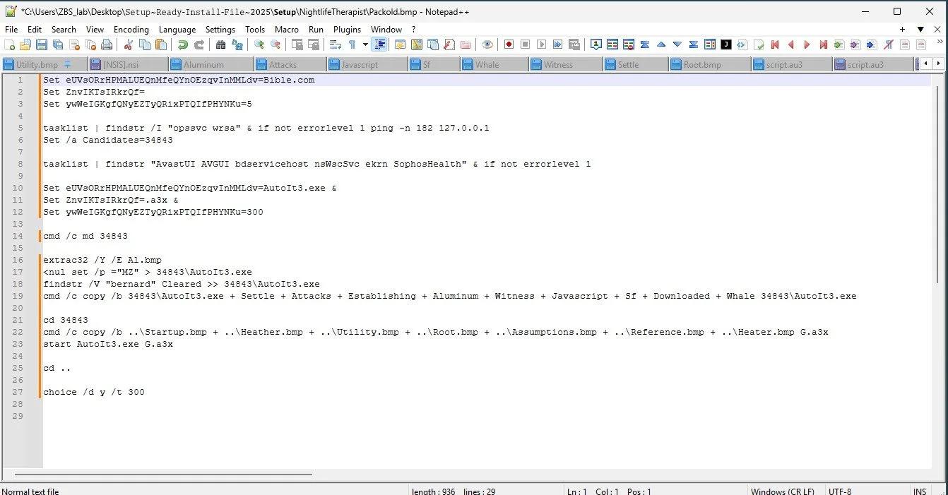 NightlifeTherapist\Pack.bmp is a very obfuscated file. However, we can de-obfuscate by taking note of the command "Set" that we see scattered through out the file .